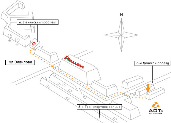 Москва Пешком: м.Ленинский проспект, выход: последний вагон из центра. Далее повернуть направо, обогнув здание метро, затем налево по направлению к ул.Вавилова (толпа идет именно туда), пересечь ул.Вавилова по пешеходному переходу, и далее идти вдоль здания торгового центра (магазин Ашан) до 5-го Донского проезда, повернуть налево, дойти до пешеходного перехода, пересечь 5-й Донской проезд, там будет проходная и проезд со шлагбаумом. Мы встретим вас у проходной. На автомобиле: координаты 55.705843,37.597735